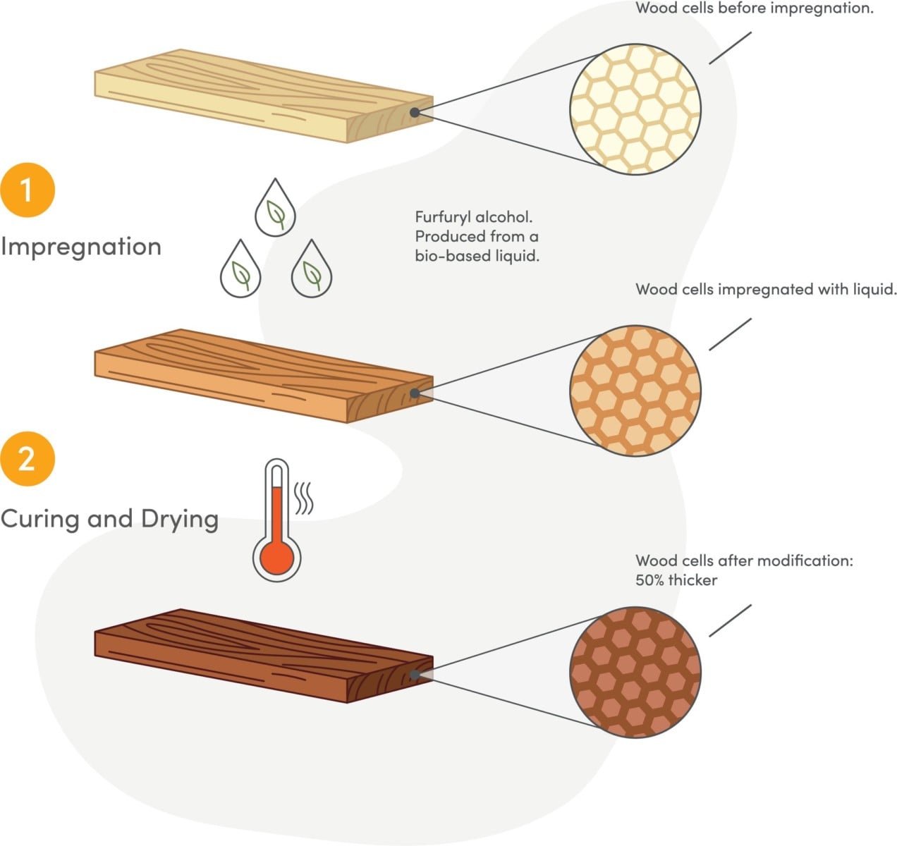 The modification process uses a bio-based liquid that increases the resistance of Kebony to rot, decay, fungi and other wood ruining micro-organisms.